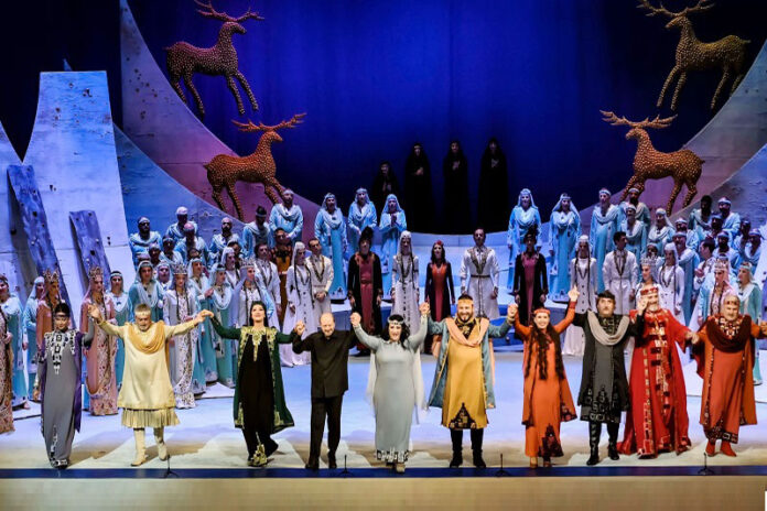 სპექ­ტაკ­ლის დამ­დ­გ­მე­ლი დი­რი­ჟო­რი გახ­ლ­დათ ზა­ზა აზ­მა­ი­ფა­რაშ­ვი­ლი, რო­მე­ლიც სპექ­ტაკლს თა­ვად დი­რი­ჟო­რობ­და და მსმე­ნე­ლის ხან­გ­რ­ძ­ლი­ვი ოვა­ცია და­იმ­სა­ხუ­რა. რო­გორც ყო­ველ­თ­ვის, შე­უ­და­რე­ბე­ლი იყო თე­ატ­რის ორ­კეს­ტ­რი, გუნ­დი, სა­ბა­ლე­ტო და­სი და ქარ­თუ­ლი ნა­ცი­ო­ნა­ლუ­რი ბა­ლე­ტი „სუ­ხიშ­ვი­ლე­ბი“.