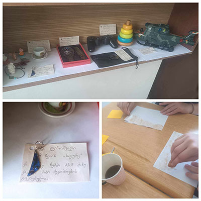 გა­ფორ­მე­ბის და გა­მო­ფე­ნის ეტა­პი – ბევ­რი ფიქ­რის შემ­დეგ გა­დავ­წყ­ვი­ტეთ, რომ ნივ­თე­ბის აღ­წე­რის ფურ­ც­ლე­ბის­თ­ვის უფ­რო გან­სა­კუთ­რე­ბუ­ლი იერი მიგ­ვე­ცა. ჩვე­უ­ლებ­რი­ვი ფურ­ც­ლე­ბი „და­ვაძ­ვე­ლეთ“ (ამის­თ­ვის გა­მო­გად­გე­ბათ ხსნა­დი ყა­ვა ან მუ­ქი ჩაი), რა­თა ისი­ნი მუ­ზე­უ­მის დო­კუ­მენ­ტებს დამ­ს­გავ­სე­ბო­და. თი­თო­ე­ულ ასეთ ფურ­ცელ­ზე მოს­წავ­ლე­ებ­მა თა­ვი­ან­თი ნივ­თე­ბის მოკ­ლე აღ­წე­რა გა­ა­კე­თეს. ზო­გი­ერთ მოს­წავ­ლეს მე და­ვეხ­მა­რე წე­რა­ში, ერ­თი ცელ­ქი ბი­ჭი ჯი­უ­ტად მე­კითხე­ბო­და, თუ რა სა­ჭი­რო იყო მა­ინ­ც­და­მა­ინც ფურ­ც­ლე­ბის „დაძ­ვე­ლე­ბა“.