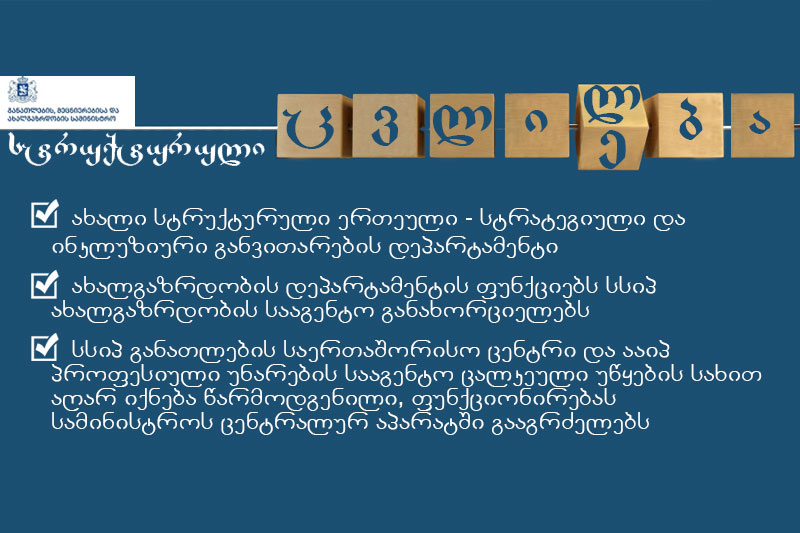 საქართველოს განათლების, მეცნიერებისა და ახალგაზრდობის სამინისტროში რეორგანიზაციის ფარგლებში, უწყების საქმიანობის ეფექტიანობის ზრდის მიზნით, რამდენიმე სტრუქტურული ცვლილება განხორციელდა.