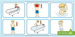3. ვიზუალური მასალის გამოყენება – წინასწარ გააცანით ბავშვს ის მოქმედებები, რა თანმიმდევრობითაც უნდა იბანაოს, ან რისგან შედგება ზოგადად ბანაობის პროცესი, მაგალითად, აჩვენოთ რომ ბანაობის დროს ვიხდით ტანსაცმელს, შემდეგ უნდა დაისველოს თავი და ტანი, წაისვას შამპუნი თავზე, შემდეგ უნდა ჩამოიბანოს და ა.შ.
